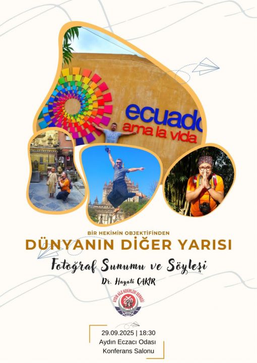 Derneğimizin sosyal etkinlikleri kapsamında üyemiz Dr. Hayati ÇAKIR tarafından "Dünyanın Diğer Yarısı" isimli fotoğraf sunusu ve söyleşi, 29 Eylül 2025' de Aydın Eczacılar Odası Konferans Salonu' nda gerçekleştirilmiştir. Etkinlikte emeği geçen yönetim kurulumuza ve Dr. Hayati ÇAKIR' a teşekkür ederiz.